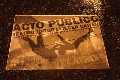 Teatro - Acto Público - Bogotá«Acto Público» es como se denomina a las exposiciones de los procesos artísticos que se instalan en contextos públicos para producir reflexiones y contenidos desde estos lugares.  El próximo  26 de noviembre  en  el contexto del septimazo, se presentara un gran “Acto  Público” en el cual se intervendrá el espacio aéreo de la fachada del Teatro Jorge Eliécer Gaitán y sus alrededores con acciones reflexivas respecto al septimazo y el teatro.