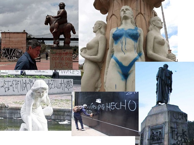Un ejemplo de la acción de los vándalos, es la Plaza de Bolívar y el Libertador, que pocos saben que fue la primera estatua de Bogotá para honrarlo y que llegó de Italia el 20 de julio de 1.846, sólo el año pasado se invirtieron 190 millones de pesos para eliminar las agresiones con tinta, tiza, spray y pintura y convertida en un orinal.