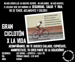 En este sentido, como una primera medida y acción colectiva, los ciclistas agremiados (en especial Ejeciclismo) convocaron a esta movilización ciclística, por la visibilización de sus realidades y particularmente  por la inseguridad ciudadana, en una urbe donde el Alcalde Mayor confía que la bicicleta sea parte integral de la solución al grave problema de movilidad que padecemos a diario.