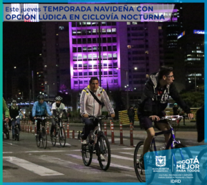 La Ciclovía nocturna es un macroevento que organiza la administración distrital en cabeza del Instituto Distrital de Recreación y Deporte (IDRD), a través del cual se ha logrado convocar a la convivencia y a la tolerancia, dando prioridad al uso del espacio público de una forma recreativa y lúdica, rodará por las principales rutas que se utilizan tradicionalmente los domingos y festivos. Además, habrá una serie de ciclopaseos por los barrios con los colectivos de bicicletas. “En la Ciclovía Nocturna de este año además de puntos de música tendremos puntos de juegos pirotécnicos, para que puedan disfrutar de esta noche”, dijo el director del IDRD, Orlando Molano.