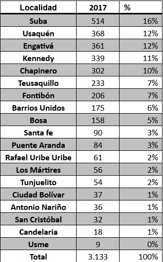 La localidad más afectada por hurtos fue la de Suba con 514 robos es decir el 16% del total, seguida por Usaquén con 368 casos y Engativá con 361. También sobre más 300 robos durante el año pasado están Kennedy con 339 y Chapinero con 302 (Ver cifras totales en el cuadro anexo).