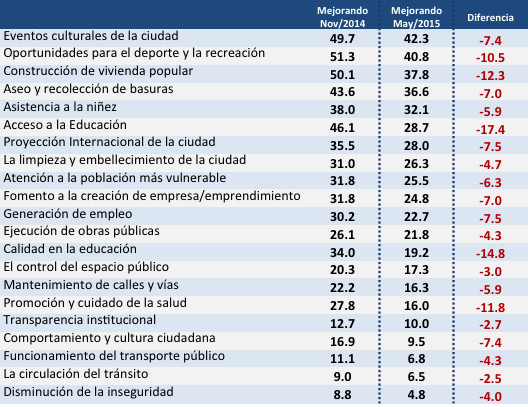 En términos de tendencia, frente a la encuesta realizada en noviembre de 2014, la percepción de empeoramiento de la ciudad que tienen los bogotanos aumenta para todos los aspectos que se consideran. Fuente: Invamer Gallup.