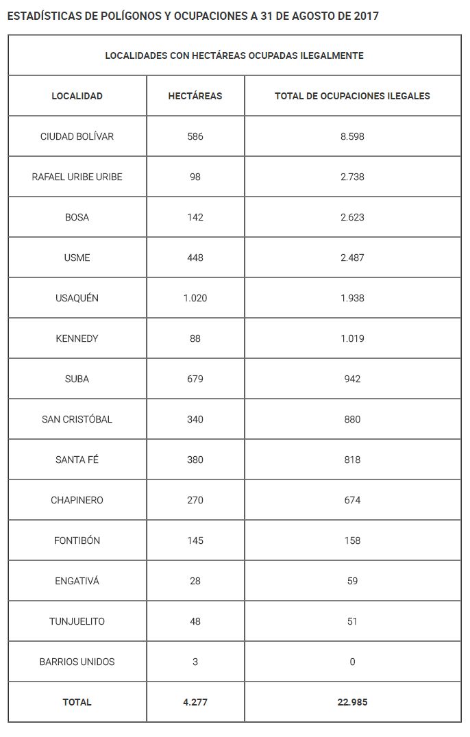 La secretaria Distrital del Hábitat encargada, Bibiana Rodríguez Campos entregó las cifras del último monitoreo de ocupaciones ilegales en Bogotá, donde se destaca que cerca de cien mil personas habitan en estos predios de origen informal, siendo Ciudad Bolívar la localidad de mayor número, con 8.598, equivalentes al 37% del total de las ocupaciones ilegales que hay en la ciudad, a la vez que explicó que los ciudadanos pueden acudir a ésta Secretaría para verificar la legalidad de los predios que van a adquirir y de esta manera evitar engaños y estafas.