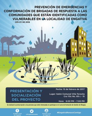 La Alcaldía Local de Engativá y la UT Engativá Gestión de Riesgo, invitan a la comunidad a participar en la socialización del proyecto de capacitación en prevención de emergencias y conformación de brigadas de respuesta, con el objetivo de proporcionar a las comunidades espacios de formación, manejo y capacidad de respuesta frente a los diferentes escenarios de riesgos que se pueden presentar en la localidad.