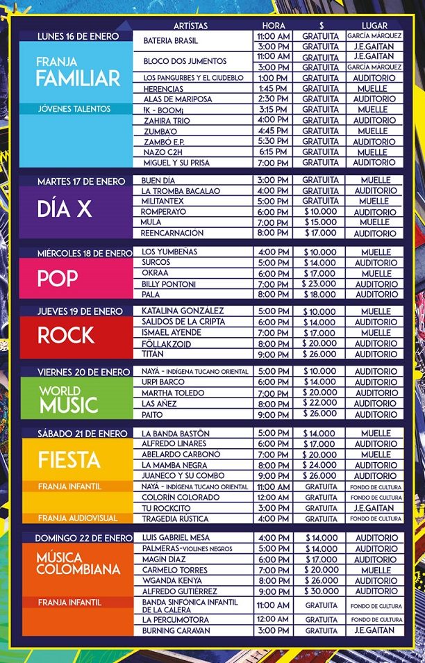 El jueves 19 de enero el rock estará representado por los nacionales Salidos de la Cripta, Catalina González e Ismael Ayende. Junto a ellos los invitados internacionales Föllakzoid (Chile) y Titán (México). Previamente, el martes 17 de enero la jornada denominada como Día X en el festival contará con la presencia de Militantex y Reencarnación desde Medellín.