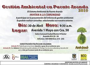 El Sistema Ambiental de Puente Aranda invita a toda la comunidad a participar en la presentación del informe de Gestión Ambiental. Allí se podrán realizar consultas relacionadas con el entorno.