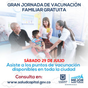 El próximo sábado 29 de julio en las 20 localidades de Bogotá se realizará una jornada de vacunación dirigida especialmente a los niños menores de seis años, mujeres gestantes y adultos mayores de 60 años, quienes son considerados la población más vulnerable de la ciudad. En la página web de la Secretaría de Salud www.saludcapital.gov.co, y en la línea «Salud para Todos» (3649666), está disponible toda la información sobre la jornada, en especial, los puntos de vacunación con los horarios de atención de acuerdo a cada sede, para que la comunidad pueda acercarse al lugar más cercano a su residencia.