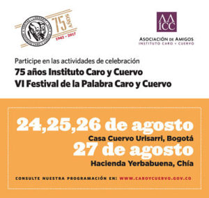El Instituto Caro y Cuervo cumple 75 años, y por tal motivo realizará durante cuatro días una serie de actividades para conmemorar la fecha de su creación en 1942, momento desde el cual el Instituto ha trabajado en torno al patrimonio idiomático de la nación. La celebración se llevará a cabo los días 24, 25 y 26 de agosto en Bogotá y el 27 de agosto en Chía (Cundinamarca). Por esos mismos días la Asociación de Amigos del Instituto Caro y Cuervo participará con su tradicional Festival de la Palabra, que este año llega a su versión número 6.