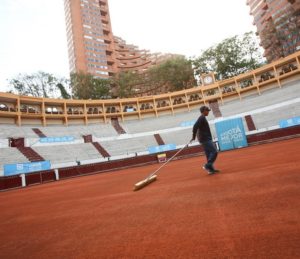 La tradicional plaza de toros La Santamaría luce un moderno campo en polvo de ladrillo, con un área de 800 metros cuadrados, que se elevó unos 25 centímetros, con el fin de proteger su superficie y así ser el escenario donde el equipo colombiano enfrentará del 15 al 17 de septiembre a Croacia, para buscar el ascenso al Grupo Mundial de la Copa Davis, el torneo de tenis por naciones más importante del mundo.