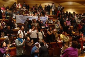 Por lo menos unas 500 mujeres se hicieron presentes en el auditorio Huitaca, de la Alcaldía Mayor de Bogotá, para presentarle a la Administración Distrital un documento realizado por más de 2.000 representantes de todas las localidades, con los aportes y propuestas de las mujeres de la ciudad, para el Plan de Desarrollo de Bogotá.