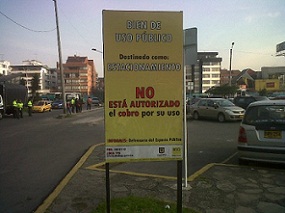 La Defensoría del Espacio Público reitera a la ciudadanía en general que individuos uniformados con chalecos, radiotransmisores y bayetillas cobran el supuesto cuidado de los vehículos en éstas zonas de parqueo público confundiendo a la ciudadanía, puesto que su cobro, entre comillas voluntario, es ilegal.