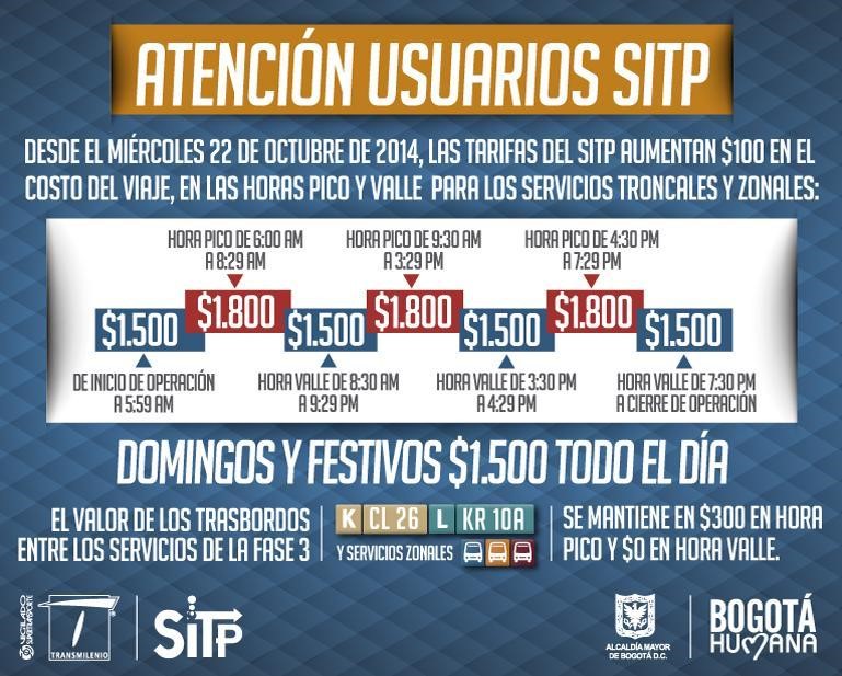 La tarifa en hora valle para TransMilenio se fijó en 1.500 pesos (estaba en 1.400 pesos). La hora valle va de 8:30 a 9:29 de la mañana, de 3:30 a 4:29 de la tarde y entre las 7:30 de la noche y el cierre de operación. Los domingos y festivos la hora valle va durante todo el horario de operación. Por otra parte, el costo del pasaje en el SITP será de 1.500 pesos, con un incremento de 100 pesos.