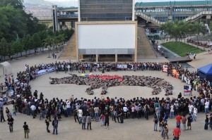 La cita antitaurina tuvo como objetivo dibujar con cuerpos humanos  -semidesnudos- un toro con las banderillas clavadas en su lomo.