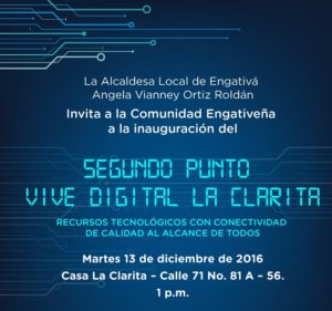 La alcaldesa de Engativá, Angela Vianney Ortíz, invita a la ciudadanía a la inauguración del segundo Punto Vive Digital en Engativá, este martes 13 de diciembre a la 1 p.m. en la Casa la Clarita ubicada en la Calle 71 N.81A-56.