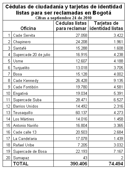 Además de las 390 mil 406 cédulas que hoy hay pendientes por reclamar en Bogotá, en las distintas sedes de atención al público ubicadas en la capital del país hay un total de 74 mil 494 tarjetas de identidad, cifra superior a la registrada hace siete meses, cuando había 65 mil 459 tarjetas listas para ser reclamadas por jóvenes entre 14 y 17 años.